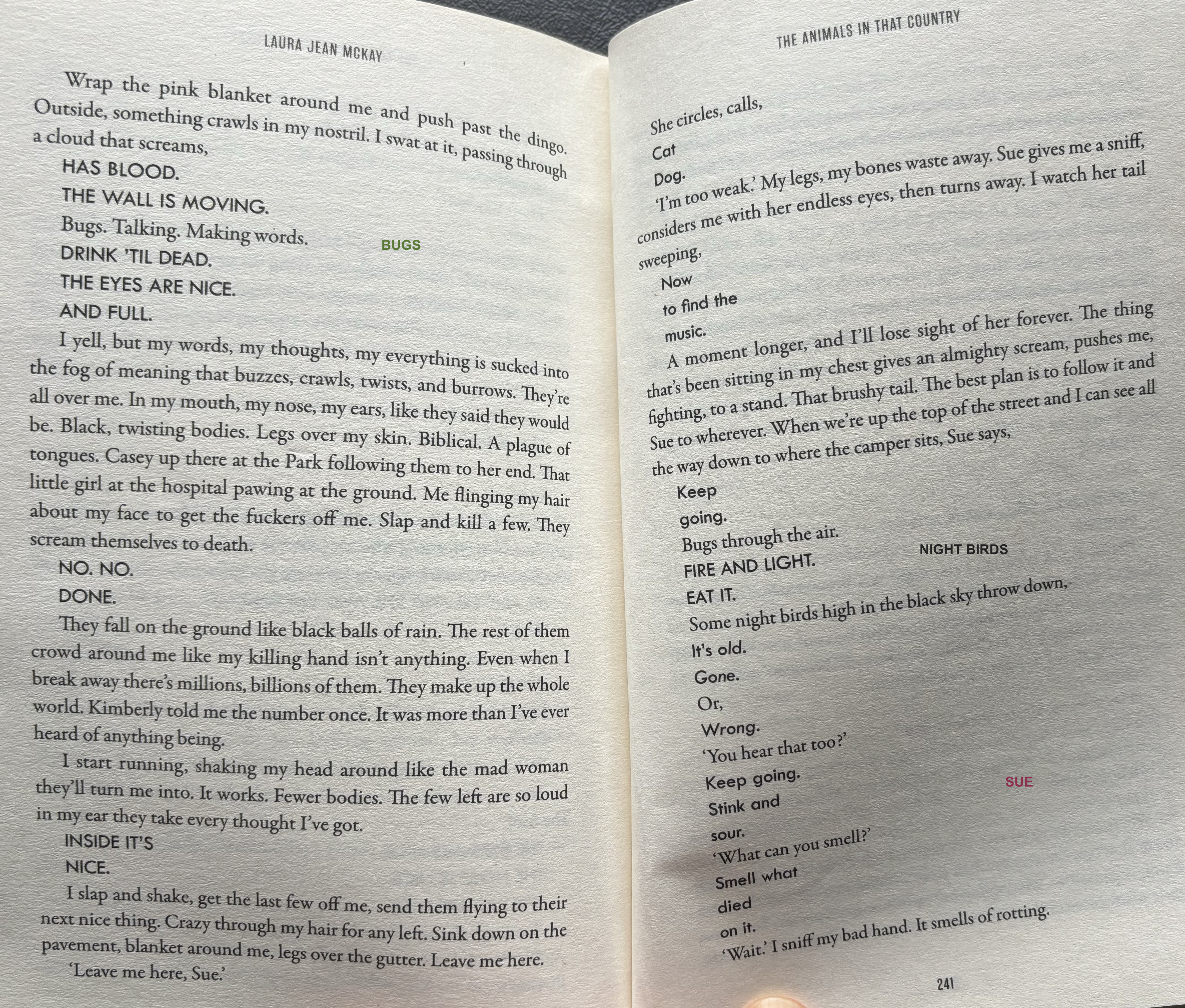 The sample below manages to include the utterances of several (labelled) species – which is rare, as the vast majority of animal-talk is Sue the dingo): dog (the dingo Sue); bugs (they are terrifying); and ‘night birds’.